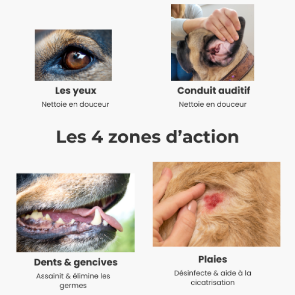 Appliquer locale, cela purifie la peau de votre chien, éviter la contamination bactérienne et favorise une bonne cicatrisation.