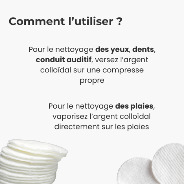 Capable de perturber les cellules des micro-organismes (bactéries, champignons, virus, parasites) et d'empêcher la multiplication des bactéries, l'argent colloïdal est un anti-infectieux efficace qui permet de réduire les inflammations et de soutenir le système immunitaire.